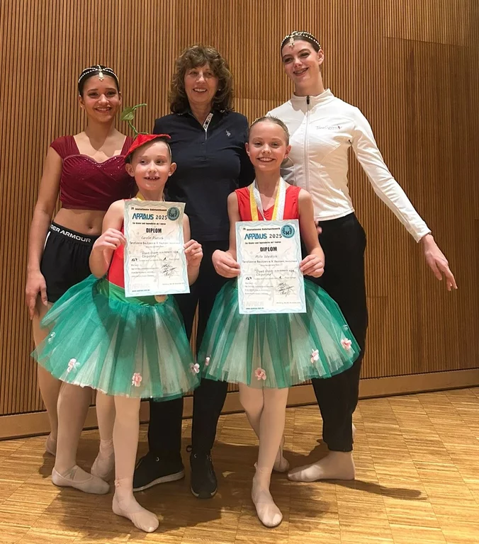 Zum ersten Mal traten unsere Ballett Minis Milla Weidlich und Carolin Pietsch bei einem Wettkampf an und gewannen in ihrem Duett beim Internationalen Ballettwettbewerb "APPLAUS" am 08. November 2025 in Gunzenhausen gleich den 1. Platz! Milla konnte im Solo Platz 2 ertanzen.